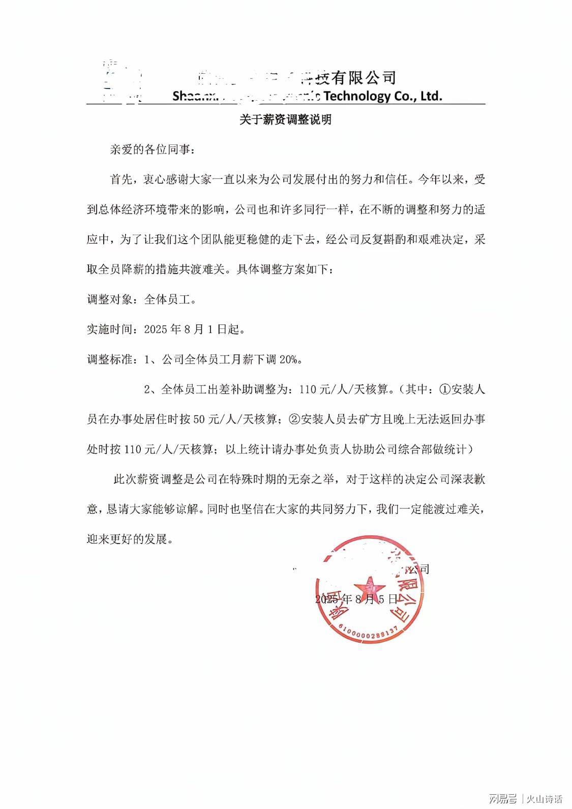 从上述内容来看,该公司声称受综合经济环境影响,遭遇前所未有的挑战,于是不得不采取全员降薪来共度难关。一个是全员月薪打8折,一个是出差补贴调整。