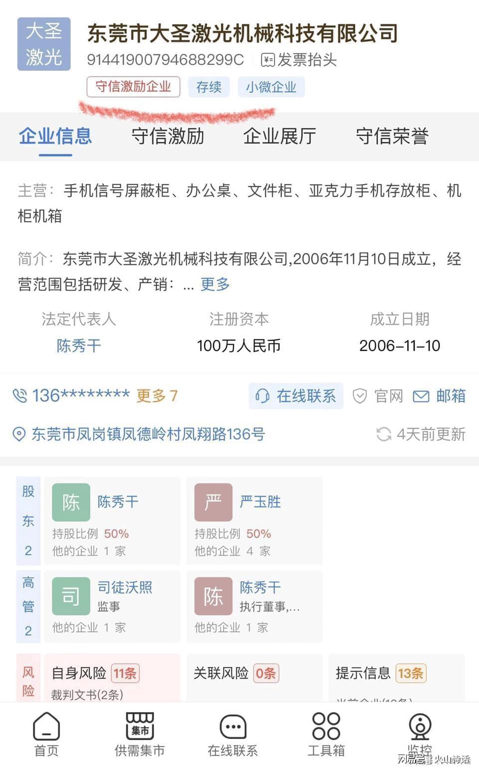 据公开信息,东莞市大圣激光机械科技有限公司于2006年11月10日成立,位于凤岗镇。经营范围包括研发、产销:激光机床、数控机床、电子元件、电子器件、五金配件、模具、配电开关控制设备、发电机自动控制装置。